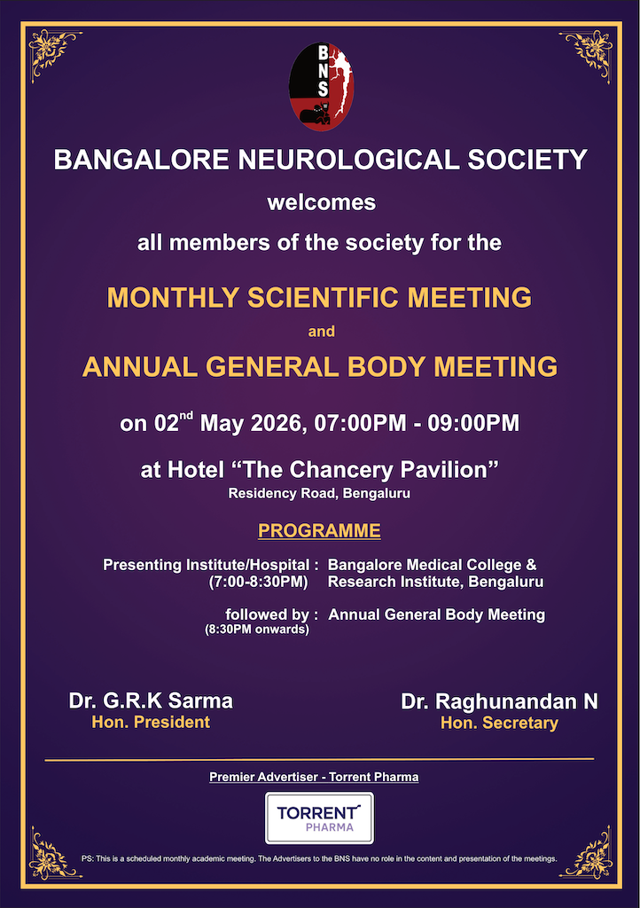 Representing neurologists, neurosurgeons and allied neuroscientists of Bangalore. Advancing knowledge in neuroscience through education, collaboration and research.
